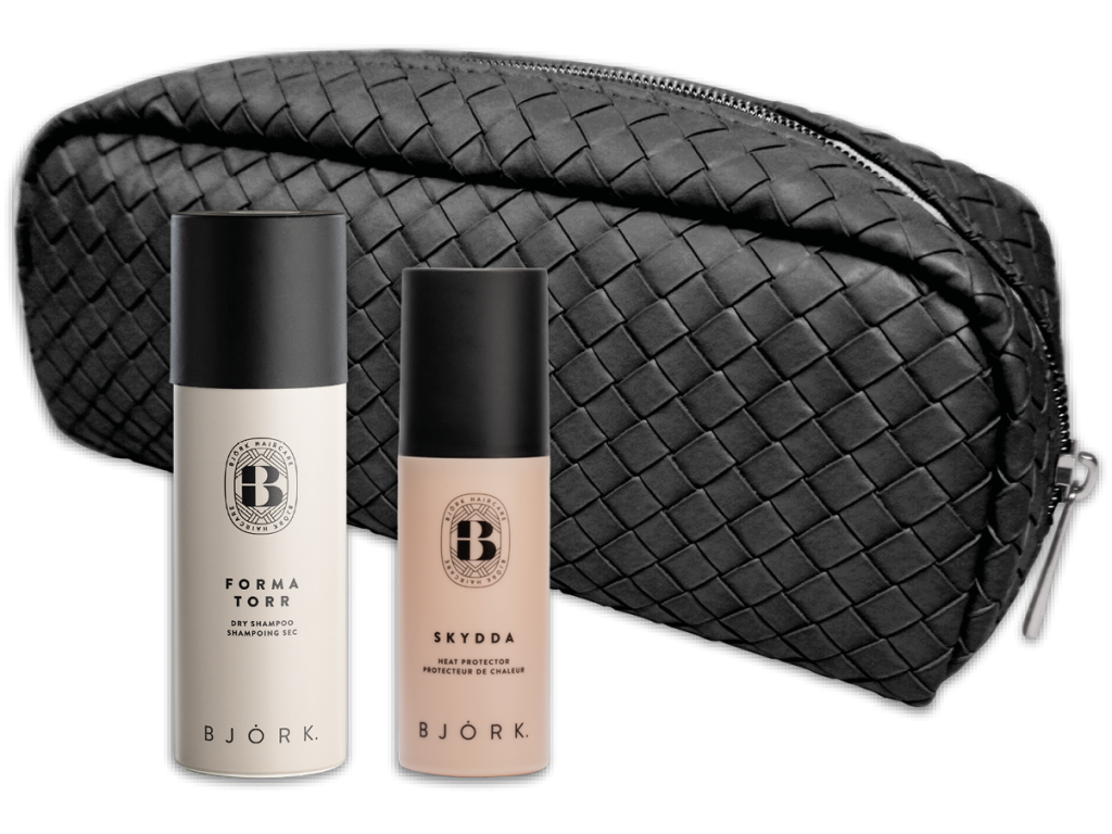 Letní balíček Styling 1 -svěžest, objem a ochrana vlasů - (suchý šampon 200 ml, ochrana proti teplu 150 ml a černý kosmetický neceser) -Björk Stylingový set pro objem a ochranu vlasů